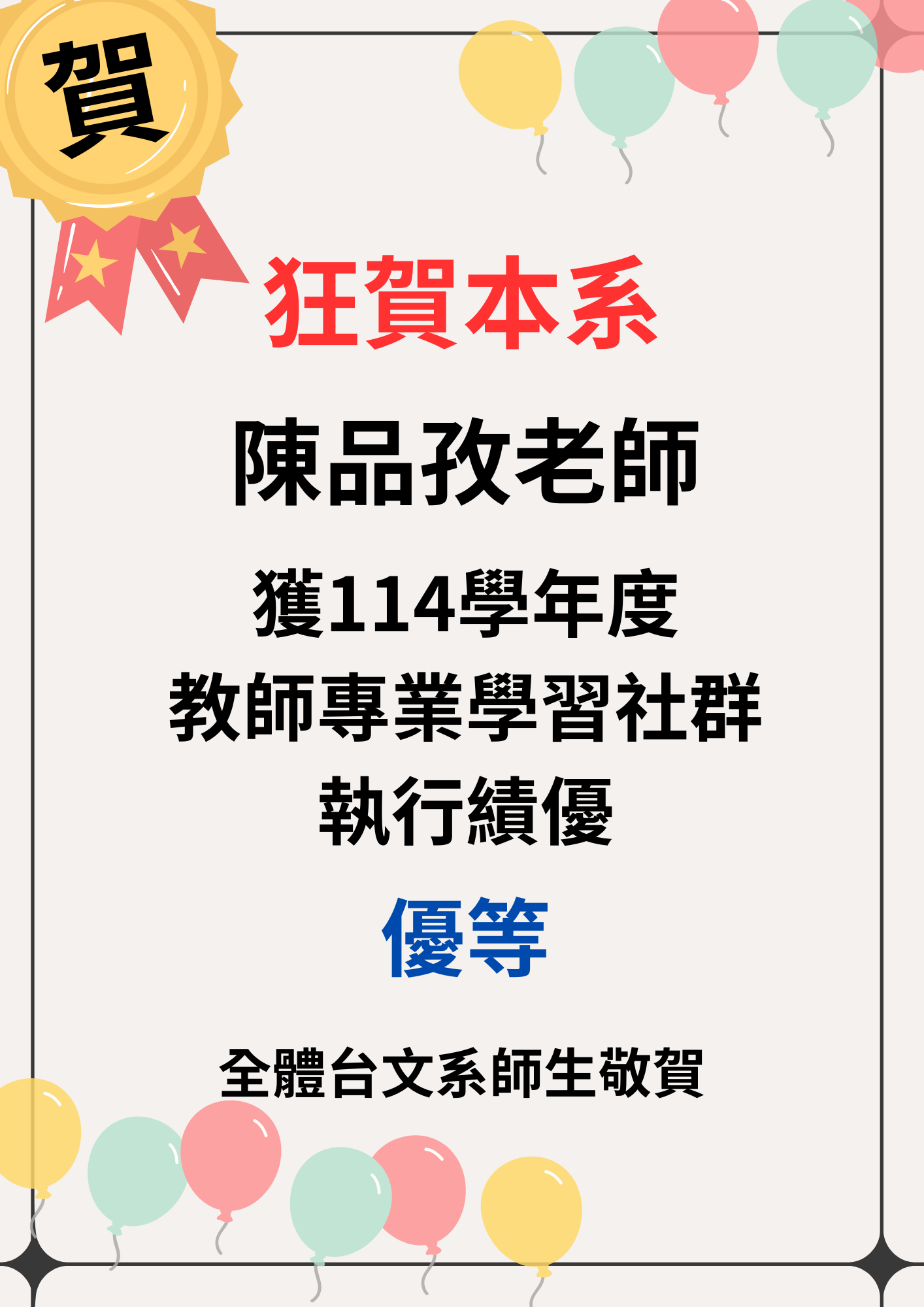 ⭐⭐狂賀!!本系陳品孜老師榮獲114年度教師專業學習社群執行優等⭐⭐